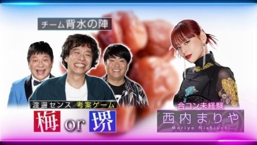 1話の合コンの中で行われ、恋のきっかけになった「梅or堺ゲーム*」。合コン未経験の西内まりやはゲームを振られると「ヤダ…」と嫌がります。口元を隠し忘れてしまう合コン素人ぶりに「何にもわかっちゃねぇな」とノブコブ吉村からの怒号が飛びます。ゲームのシンキングタイムでは、合コン百戦錬磨の芸人たちがノリノリで踊り出し盛り上げる場面も。現場は全員「梅」に投票、その結末はいかに…?