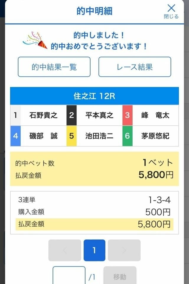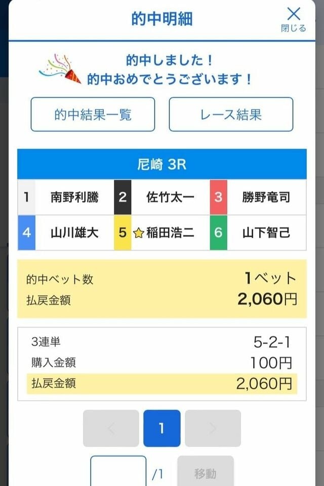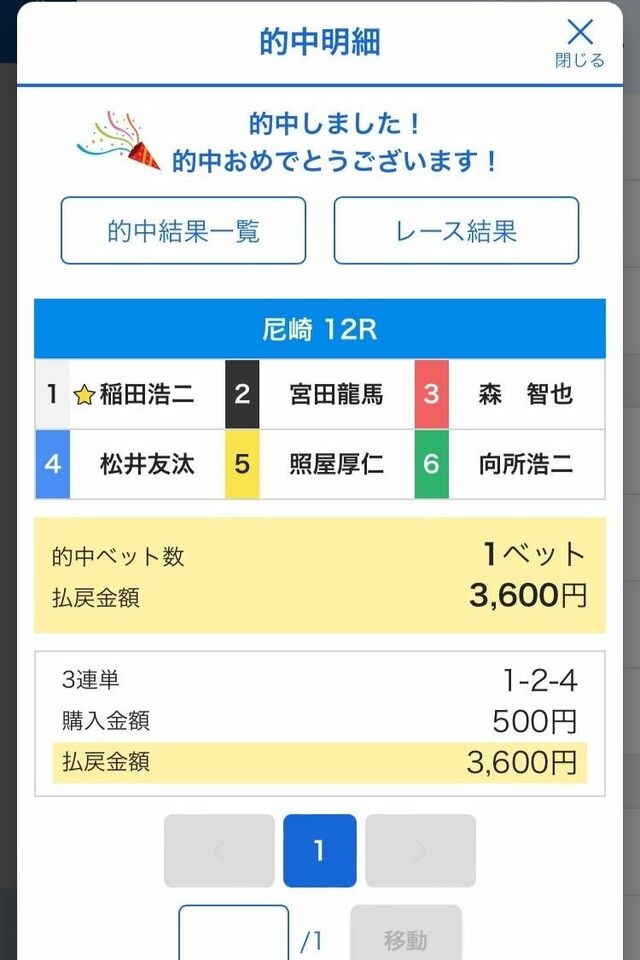 そして、最後にやってきたのは我が地元ボートレース尼崎で開催された「歳忘れ今年もありがとう競走」! カワノが絶対的信頼を置く、兵庫支部の稲田浩二選手が出場! 今年のマイナスを取り戻すべく「稲ちゃんに全ベットじゃ~!」とした結果……。出るわ、出るわ、連続的中!