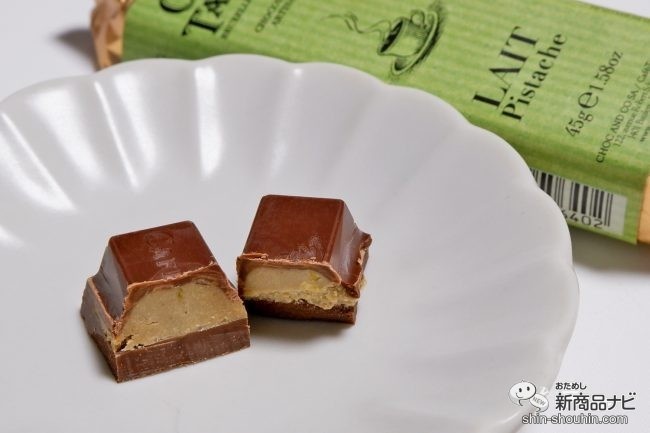 ピスタチオミルクチョコこちらは2層になっている。刻んだピスタチオが入っており、芳醇な香りと濃厚さ。舌の温度でスッととけていくなめらかなチョコレート。