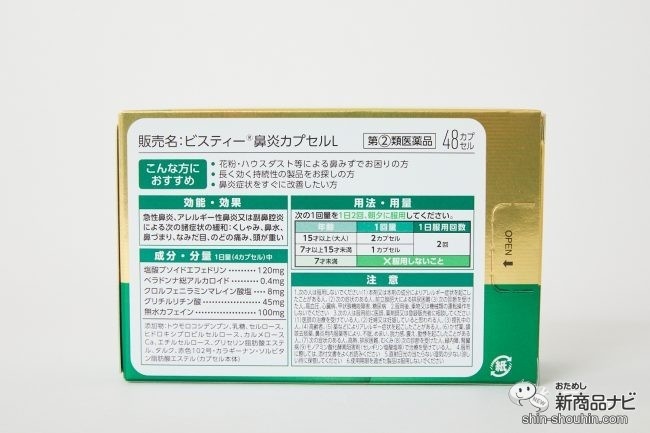 既存品の「ノスポール鼻炎カプセル」から、処方強化して大きく2点リニューアルされている。1つ目は、鼻粘膜のはれを抑える「塩酸プソイドエフェドリン」が70mgから120mgに増量したこと。2つ目は、新たに鼻炎の症状を抑える「グリチルリチン酸」を45mg追加したことだ。