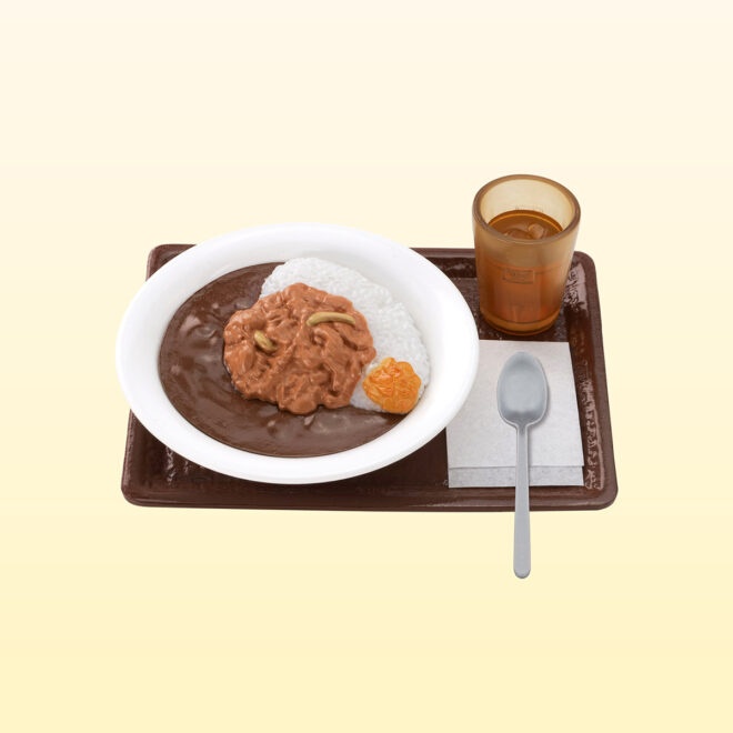 カレーに牛肉がトッピングされた、牛カレー。付属品の麦茶、紙ナプキン、スプーンをトレイに乗せてセットします。紙ナプキンはリアリティを追求し、紙素材を使用。トレイは凸凹の造形で表面のざらざらとした手ざわりまで再現。