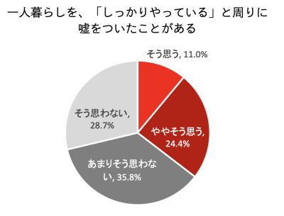 それだけでなく、35.4%は一人暮らしを「しっかりやっている」と周りに嘘をついた経験があるといいます。また「一人暮らしあるある」には、次のような回答が寄せられました。