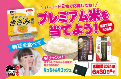 キャンペーン内容は、超・細か~いきざみ納豆ミニ2、超・細か~いきざみ納豆ミニ3のいずれかの商品のバーコード2枚を集めて応募すると、JAグループ秋田主催「美味しいあきたこまちコンテスト」で入賞した生産者5名による優秀賞受賞米「ザ・プレミアムファイブ」と、優良味米を安定生産している生産者による「特別栽培米」の2種類のプレミアム米セットが、抽選で毎月50名様、期間中合計150名様に当たるというものです。