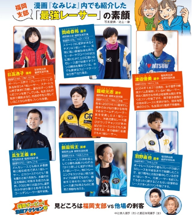 今回の福岡ダービー!漫画アクション杯には上記のスーパースターは出場しないものの、やはり見どころは地元・福岡支部のレーサーと他場の選手との意地とプライドをかけた壮絶なバトル。中でも注目したいのが福岡支部のA1級レーサーである中辻崇人選手と渡辺浩司選手です。中辻選手は1月にBOATRCE徳山で開催された『GⅢマスターズリーグ第10戦』で優勝を飾るなど目下上り調子、渡辺選手も持ち前の安定した状態を維持しています。これに対して他場の刺客A1レーサーは大阪支部の繁野谷圭介選手、広島支部の田中辰彦選手、兵庫支部の重木輝彦選手、岡山支部の村岡賢人選手と、いずれもクセ者揃い。水上の格闘技との異名を持つボートレースは福岡の地で戦国時代さながらの決戦が繰り広げられることが予想されます。選手たちの熱き闘いをぜひ目前で体感してください。