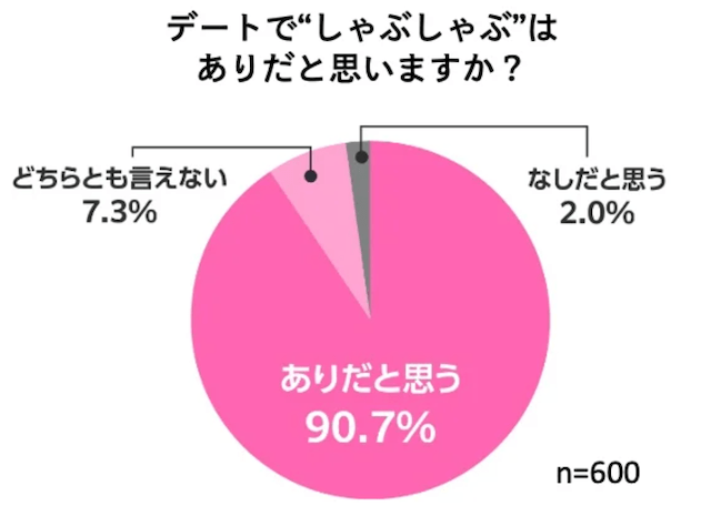 実際に20〜50代の男女600名を対象に行った調査によると「デートにしゃぶしゃぶは“あり”」と9割以上が回答しています。