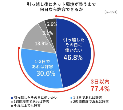 けれど、前もってうまくスケジューリングしないと、引越し先でのネット環境整備には時間がかかってしまいがち。引っ越し後にインターネットが使えるようになるまでどれぐらい待つことを許容できるかを尋ねたところ、「その日に使いたい」(46.8%)が約半数を占め、3日以内とあわせると、約8割(77.4%)という結果になりました。