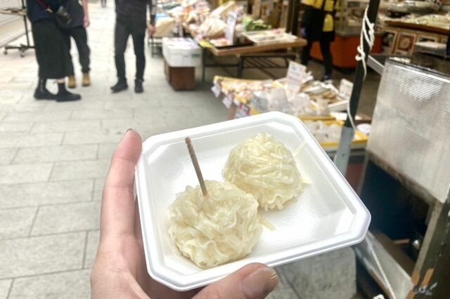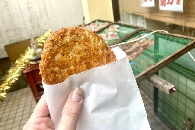 朝市での目的は食べ歩き! まずは唐津のご当地B級グルメ。タラなどの白身魚のすり身に野菜を混ぜて衣で揚げたコロッケならぬ「魚ロッケ」。すり身がフワフワで甘味があっておいしい〜。 味はさつま揚げにも似てるかも。これは……朝から飲みたくなりますね!
