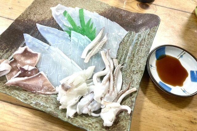 そして、呼子といえばイカの刺身を食べないわけにはいきません! 1月から3月が旬といわれるヤリイカ。ヤリイカは初めて食べますが、今までこんなに透明なイカを見たことがあっただろうか。