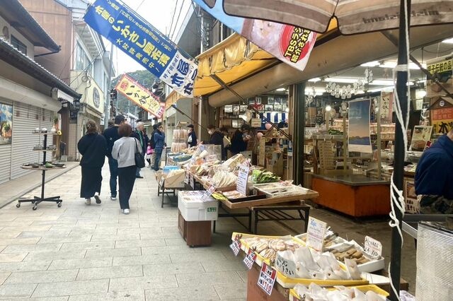 お目当てはもちろん「呼子朝市」。毎日、朝7時半からお昼まで開かれる朝市で、路上では様々な呼子の名産品が売られています。おばちゃん達の元気な声が飛び交っていて活気があります。