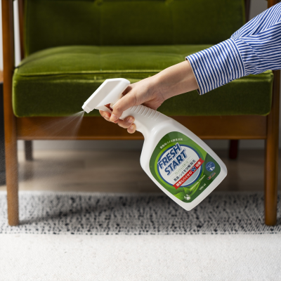 フレッシュスタートを臭いの元やシミ汚れに浸透するよう十分にスプレーし、やわらかいブラシ・スポンジ等で軽くこすり、その後、自然乾燥させればOK!頑固な臭い、汚れにはこの作業を何回か繰り返します。
