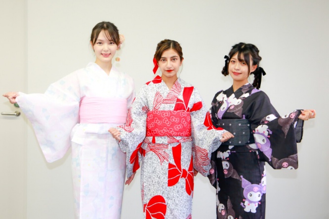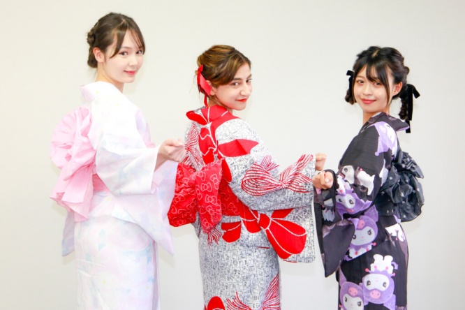 浴衣だけではなく、それぞれの帯はキャラクターごとに異なる結び方になっていて、ハローキティの帯はアイコンである赤いリボンの形の帯で、さらに模様としてもリボンがあしらわれている。