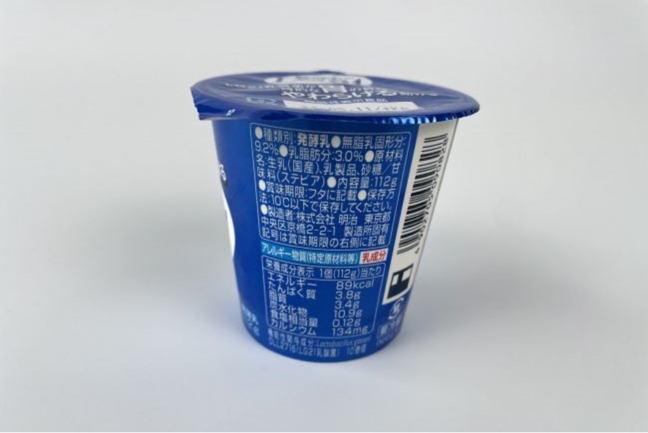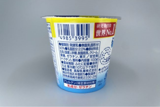 糖質の記載はなし、脂質3.4g、たんぱく質3.9gであり、特許取得のR-1乳酸菌EPS(多糖体)を作りだす1073R-1乳酸菌を使用している。カロリーは112g当たり89kcal、1g当たり1.24円で、総合的なコストパフォーマンスにも優れている。