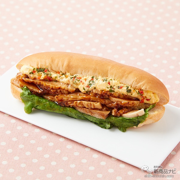 テリヤキ風に味付けした鶏もも肉に、玉子ピクルスマヨソースとグリーンリーフをサンドした、惣菜タイプのコッペパン。