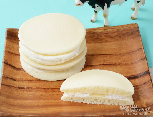 ミルクの風味豊かなクリームとホイップクリームをはさんだ白いパンケーキ。