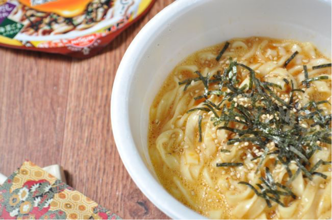 麺はどん兵衛おなじみのモチモチ食感で卵ともよく絡む。海苔とごまの風味も良く、贅沢で濃厚な味わいが楽しめる一品だ。