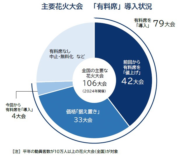 約7割で有料席導入国内で7~9月に開催される主要な106の花火大会のうち、約7割にあたる79大会で観覧エリアに「有料席」を導入していることが判明。