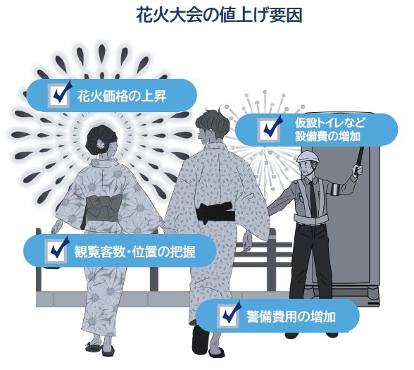 打ち上げコストの増加なお、花火大会では、運営費支出の多くを占める花火の打ち上げコストの増加が続いている。