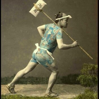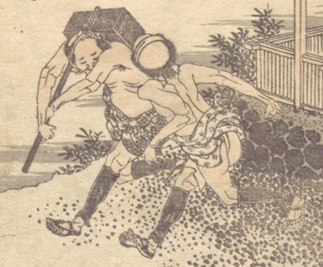 飛脚の通常スタイルとして、上半身はもろ肌ぬぎで足に脚絆を着用したスタイルや、股引のようなパッチ1枚で上半身は裸スタイル、さらに自慢の入れ墨を見せたい場合は褌一丁がスタンダードだったようですね。