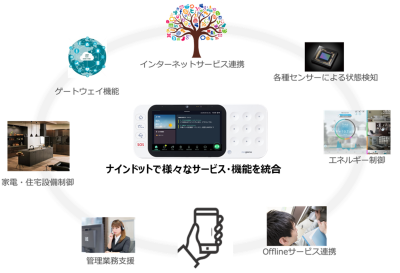 『ナインドット』は、インターホンモニター、ホームIoT、HEMSモニター、セキュリティ、見守り、生活サービスの全てを一台に搭載したホームIoT端末です。また、管理会社向けには無人内見時の物件案内や、入居者へのお知らせ通知、自社サービスとの連携等、入居者だけでなく事業者にメリットのある機能を多数搭載しています。