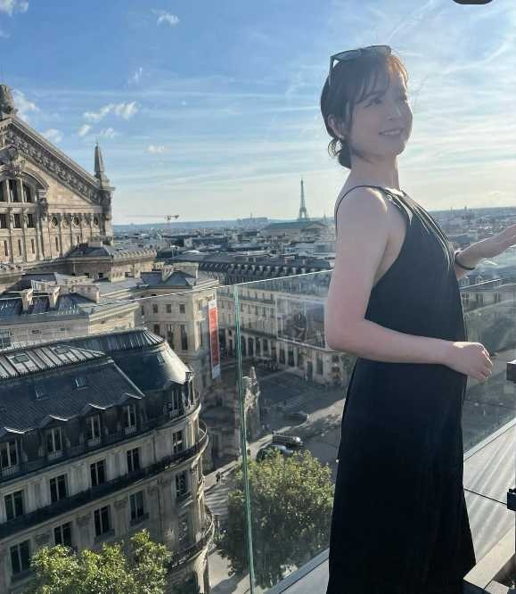 この日の投稿では、五輪マークが掲げられているライトアップされたエッフェル塔をバックに、背中が大胆に開いた黒のドレスを着た姿や、パリの街並みを背景にした写真など複数枚公開した。
