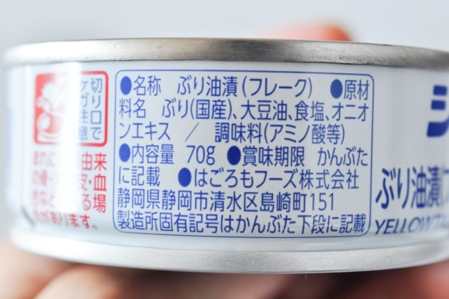 原材料は、ぶり(国産)、大豆油、食塩、オニオンエキス/調味料(アミノ酸等)。ぶり油漬けのフレークタイプである。