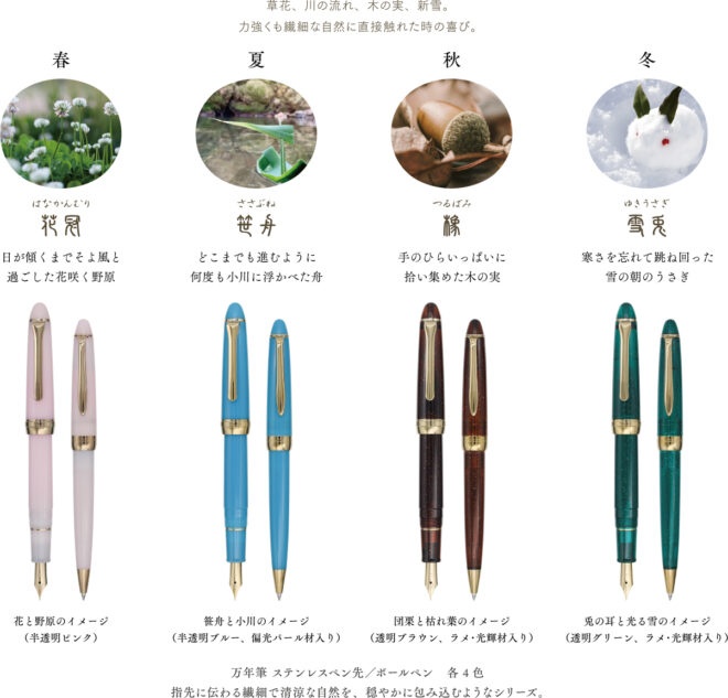 草花、川の流れ、木の実、新雪。力強くも繊細な自然に直接触れた時の喜び。季節ごとの自然と触れ合う遊びをモチーフにした透明感のある4色展開で、万年筆とボールペンで絶妙に異なる透け感も特長。