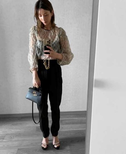 この日の投稿では、「日中がまだ暑かった日。ボトムスと靴だけ替えて」とつづり、昼間と夜でボトムスを変えた”着回しコーデ”を披露した。ブラトップに透け感のあるトップスを着用し、お昼はデニムを合わせラフなコーデ。夜はジャケットを羽織り、シックなコーデを披露した。