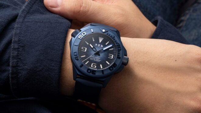伝統文様の青海波がエンボス加工された文字盤には、北斎館のロゴ。深みのある鮮やかなIIPブルーメッキを施したチタン・グレードⅡケースとセラミック製ベゼル、そしてしなやかなベルトが、北斎の名作の力強さとインパクトを美しく表現しています。