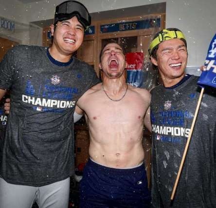 この日の投稿では、「4 more」とつづり、チームメイトとともにリーグ優勝を喜ぶ様子や、山本由伸らとシャンパンファイトを楽しむ様子、また、ドジャースのユニホームを着た愛犬・デコピンとのバックショットなどを披露した。