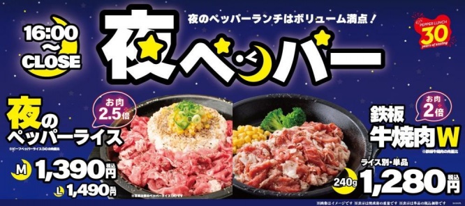 夜のペッパーランチが超パワーアップ!通常サイズに比べて「牛焼肉」はお肉2倍、「ペッパーライス」はなんと驚異の2.5倍に! お腹も心も大満足間違いなしです。