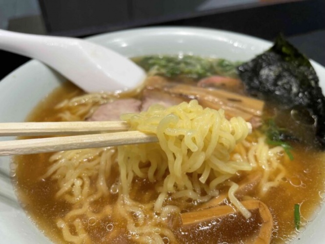まずスープを味わうと、すっきりとしたキレのある醤油の味わいがあとを引く。一口スープの飲めば、もう一口飲みたくなる、そんなヤミツキになりそうな淡麗系醤油スープなのだ。