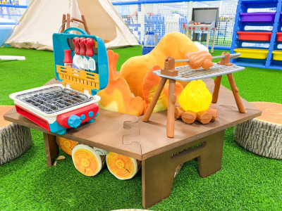 テントやハンモックなどの本格的なアイテムを使ったキャンプごっこ遊びが楽しめるユニークなキャンプコーナーではアウトドア気分をご満喫いただけます。【公園コーナー】