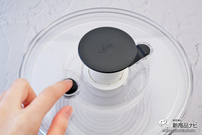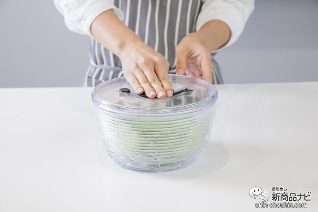 フタのノブを押すだけで、中のカゴが回転する。何度か押せばしばらく回り続けるので、その間に別の作業が可能!