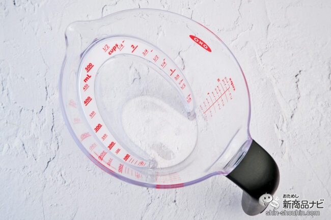 今まではカップ側面のメモリを見るのに、いちいち屈んでいたが…その手間がいらず調理がスムーズに! 持ち手もしっかりしていて、中身も注ぎやすかった。これに慣れると、もう普通の計量カップは使えなくなるかもしれない!?