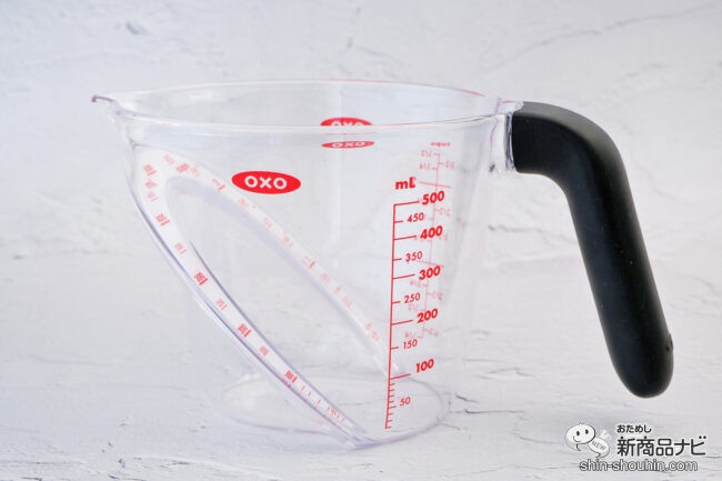「アングルドメジャーカップ(中/500mL)」は、カップの内側にもメモリが付いていて、上から見るだけで簡単に計量・調整できる優れもの。