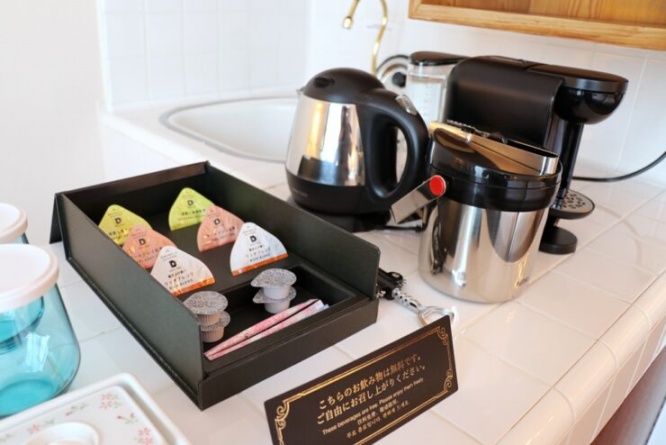 コーヒーマシン用のコーヒー・紅茶・緑茶のポッドが用意されていて、自由に飲めます(無料)。