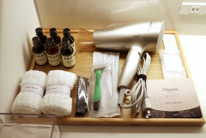 アメニティは、ボディタオル、歯ブラシ、シャンプー・コンディショナー・シャワージェル・クレンジング・洗顔料・オールインワン・髭剃り・シェービングフォームなどが用意されています。シャンプー・コンディショナー・シャワージェルはアルガンオイルをベースにしたARGAN(アルガン)のもの、ドライヤーは、髪を乾かしながら温冷ヘッドスパもできる高機能のナノケアです。