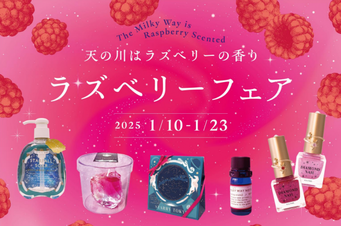 コニカミノルタプラネタリウム株式会社は2025年1月10日(金)から1月23日(木)まで、同社が展開するプラネタリアTOKYO(有楽町)、プラネタリウム満天NAGOYA(名古屋)など全5館で、『“天の川はラズベリーの香り” ラズベリーフェア(以下、ラズベリーフェア)』を開催します。天の川銀河の香りに含まれている「ギ酸エチル」はラズベリーにも含まれる有機化合物です。『ラズベリーフェア』は毎年人気のイベントで、全館に併設されているショップ「Gallery Planetaria(ギャラリープラネタリア)」ではラズベリーの香りや色にちなんだアイテムを取りそろえています。