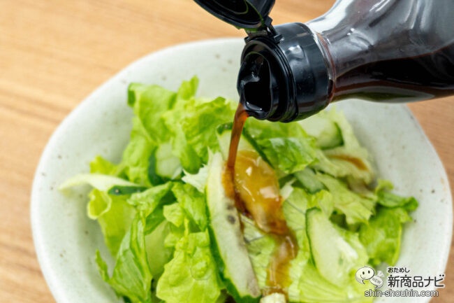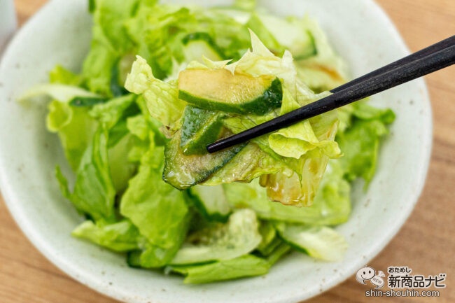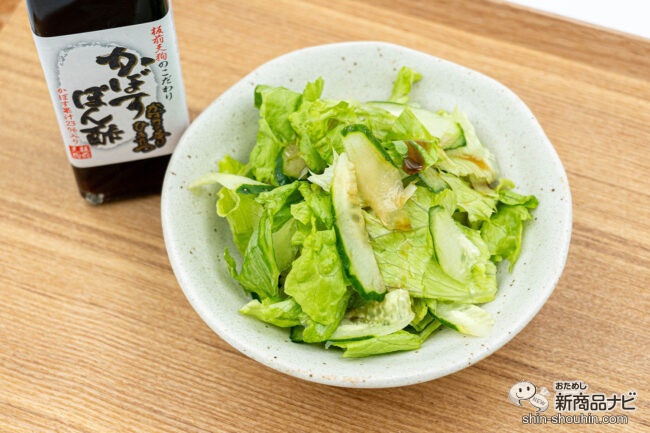 さっそく一口食べてみると、きゅうりとレタスのシャキシャキとした食感とぽん酢の酸味がよく合い、爽やかで軽やかな味わいが楽しめた。サラダを口に運ぶたびにかぼすが香り立ち、生かぼすを搾ったような仕上がり。普段使いのぽん酢よりも果汁をしっかりと感じられた。