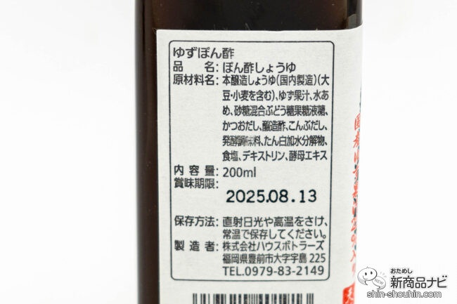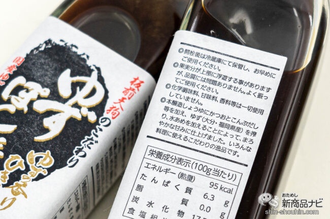 かつおと昆布だしなどを加えた本醸造しょうゆに、大分県と福岡県産の「ゆず」をふんだんに加えており、水あめを使うことで口当たりの良い甘さに仕上げている。