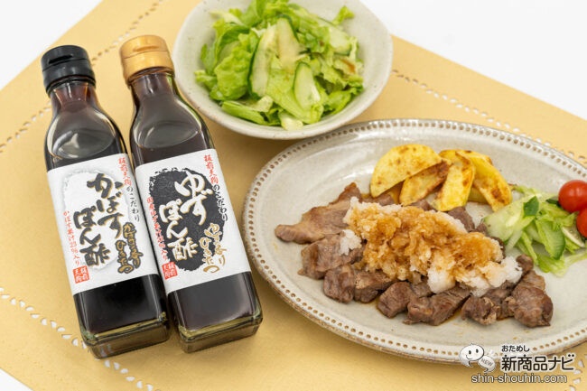 果汁を20%以上使った『かぼすぽん酢』と『ゆずぽん酢』は、果汁の爽やかな酸味が料理を引き立たせてくれる本格ぽん酢。