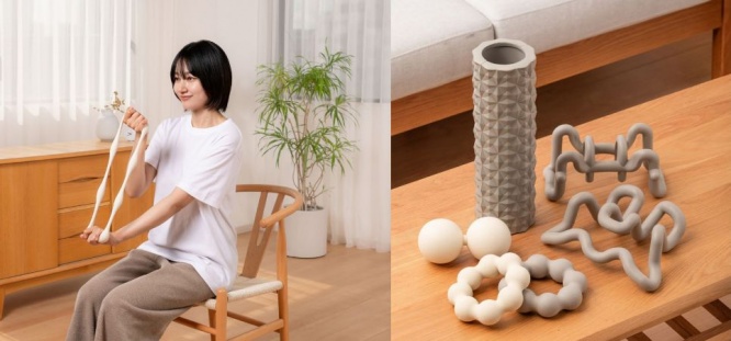 今回発売されたのは、ソフトタイプとハードタイプのトレーニングチューブ、ミニフォームローラー、ストレッチボール、2種類の指圧代用器。トレーニングチューブは二の腕のトレーニングに最適なアイテムだ。二の腕の内外へ同時にアプローチ可能で、気になるパーツを引き締めることができる。