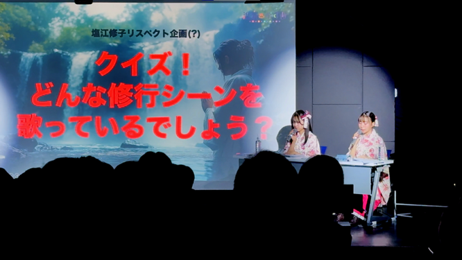 後半は、どんな行動も修行ととらえる温泉むすめ・塩江修子リスペクト企画(?)として、温泉むすめならではのムチャぶりクイズ「どんな修行シーンを歌っているでしょう」。歌の歌詞の端々から想像をふくらませ、修行内容を当てるという超難問を正解しつつも珍回答が続出した。