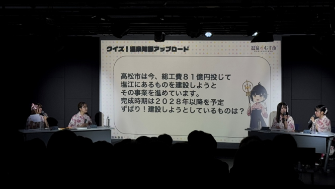各温泉むすめの自己紹介の後、最初のコーナーは「温泉知識アップロード」。この5年あまりの草津、秋保、志摩、塩江、4人の温泉地にまつわるニュースをクイズ形式で学んでいくコーナーで、今年、草津で公開された歴史的文書や高松市の新しい何かの駅の建設計画などがお題に。