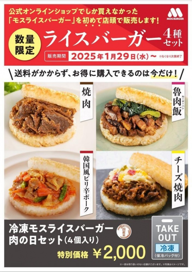 1月29日と2月9日の"ダブル肉の日"にちなんだセットお肉を使用した4種類の冷凍モスライスバーガーがスペシャルアソートで店頭に登場します。オンラインショップ限定で販売している冷凍モスライスバーガーを店頭で販売するのは今回が初めて。