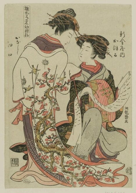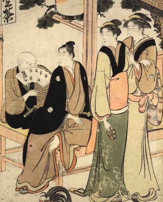 神社の食事処でのお見合い。鳥居清長 長い羽織も流行っていた。