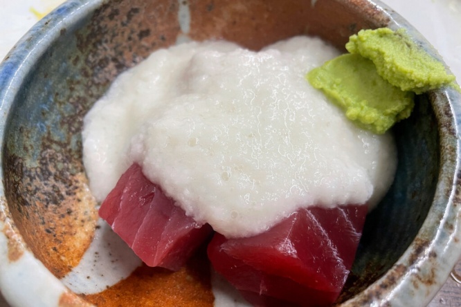 旅館で提供された食事は、マグロの山かけ、刺身、カレイの煮付け、グリルチキン、サバの塩焼き、海老マヨネーズ焼きなど。