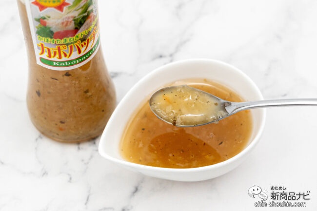 ギュッと搾ったカボスが20%配合されていることで、とろみがあり素材との絡みがよさそうだ。本品もハーブの香りが心地よく、カルパッチョはもちろん焼き魚、お豆腐、お鍋のつけダレとしても活躍してくれるだろう。