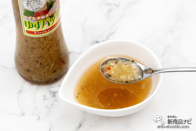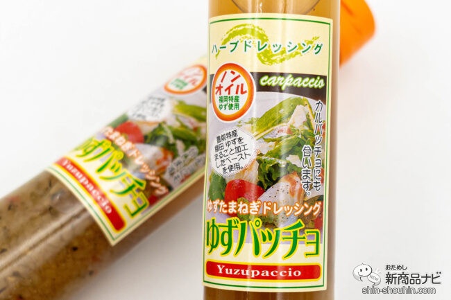 『ゆずパッチョドレッシング』は、福岡県豊前市の特産「棚田ゆず」を皮からまるごと使用しており柚子の香りと味わいを丸ごと味わうことができる。