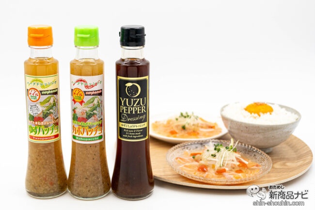 こだわりの国産素材で作られた『ゆずパッチョドレッシング』『カボパッチョドレッシング』『ゆずごしょうドレッシング』は、素材の食感や旨味、香りを存分に味わえる仕上がり。ノンオイルドレッシングだから、たっぷり食べても重すぎないのもグッドだ。合わせる料理の味をそれぞれの個性で引き立たせてくれる優れものたちをぜひ手に取ってみて。